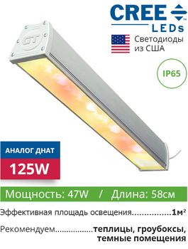 Серия GT Sunlight. Фитосветильники полного спектра на основе светодиодов CREE (США). Имеют широкий спектр аналогичный солнечному. Идеально подходят для досветки цветов и многолетних растений в домашних условиях и оранжереях в условиях близких к естественному свету. Спектр света данных фитоламп не дает дополнительной нагрузки на зрение человека и не требует выключения фитолампы или использования специальных очков при работе с растениями.