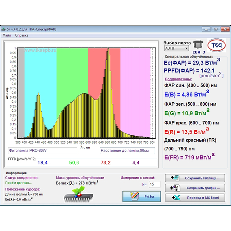 Замер PPFD производился сертифицированным оборудованием "ТКА-СПЕКТР ФАР" в центральной точке фитосветильника на высоте 300мм. (*Замер фитосветильника GT Sunlight 20W производится на высоте 200мм).